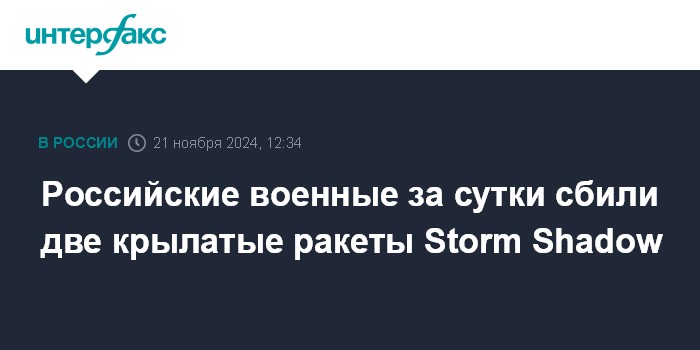 Москва. 21 ноября. INTERFAX.RU - В министерстве обороны РФ заявили, что за прошедшие сутки средства противовоздушной обороны сбили две крылатые ракеты Storm Shadow производства Великобритании.