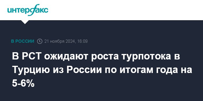 Москва. 21 ноября. INTERFAX.RU - Туристический поток в Турцию из России по итогам 2024 года может вырасти в пределах 5-6% и достичь 6,7 млн человек, среди причин роста - взвешенная ценовая политика турецких отельеров, считают эксперты Российского союза туриндустрии (РСТ).