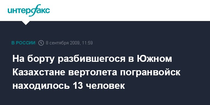 Москва. 8 сентября. INTERFAX.RU – На борту потерпевшего крушение во вторник в Южно-Казахстанской области вертолета МИ-8 пограничной службы Комитета национальной безопасности (КНБ) Казахстана находилось 13 военнослужащих, включая экипаж, сообщила пресс-служба КНБ.