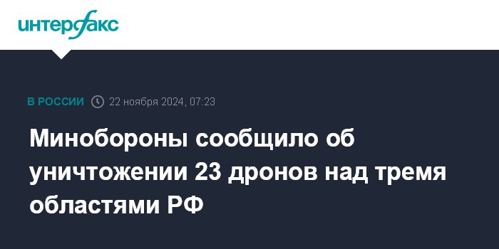 Москва. 22 ноября. INTERFAX.RU - Средства противовоздушной обороны нейтрализовали 23 дрона ВСУ над Брянской, Калужской и Курской областями, сообщили в Минобороны РФ.