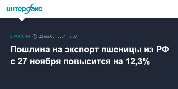 Москва. 22 ноября. INTERFAX.RU - Ставка пошлины на экспорт пшеницы из РФ с 27 ноября повысится на 12,3%, до 3 020,3 рубля с 2 689,7 рубля за тонну неделей ранее, сообщает Минсельхоз.
