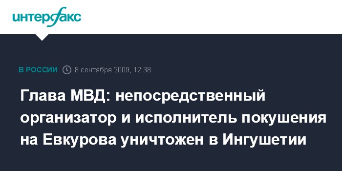 Москва. 8 сентября. INTERFAX.RU – В Ингушетии уничтожен непосредственный организатор и исполнитель покушения на Евкурова, который также причастен к взрыву РОВД в Назрани, сообщил во вторник журналистам глава МВД РФ Рашид Нургалиев после антитеррористических учений, прошедших под Новочеркасском.
