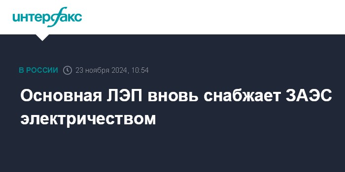 Москва. 23 ноября. INTERFAX.RU - Подача электроэнергии возобновлена на Запорожскую АЭС по основной линии 750 кВ, сообщили в субботу представители станции.