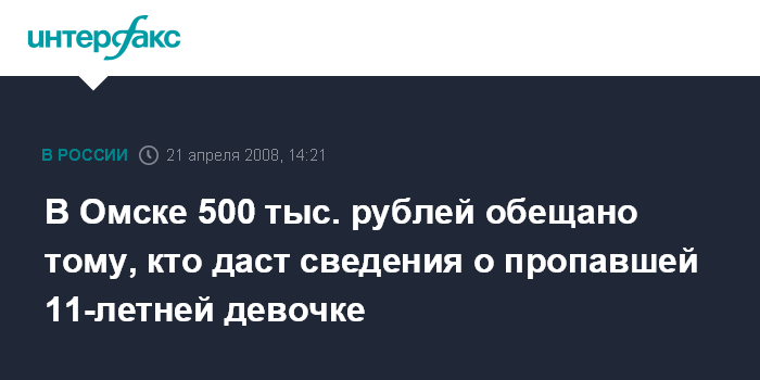 "Губернатором Омской области Л.К.Полежаевым объявлено о выплате денежного вознаграждения в размере 500 тысяч рублей за достоверную информацию о местонахождении Некрасовой Даши, 1996 г.р., которая 9 апреля 2008 гола ушла из школы № 46 по адресу: ул. Бородина, 19", - говорится в сообщении УВД по Омской области.