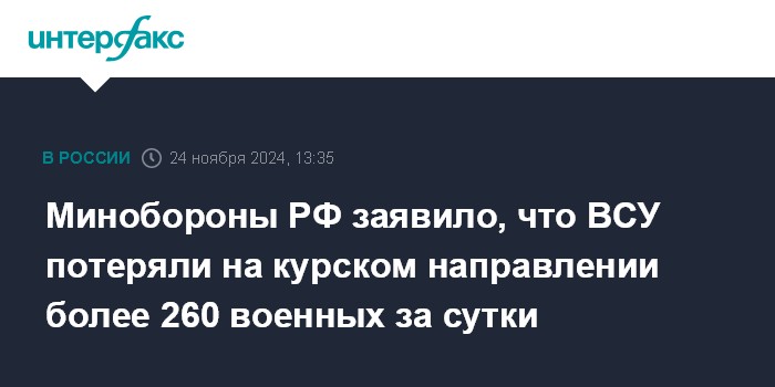 Москва. 24 ноября. INTERFAX.RU - Потери армии Украины на курском направлении за сутки составили более 260 военнослужащих, заявили в Минобороны РФ в воскресенье.