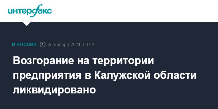 Москва. 25 ноября. INTERFAX.RU - Губернатор Калужской области Владислав Шапша сообщил о ликвидации возгорания на территории промышленного предприятия в Калужской области, пострадавших нет.