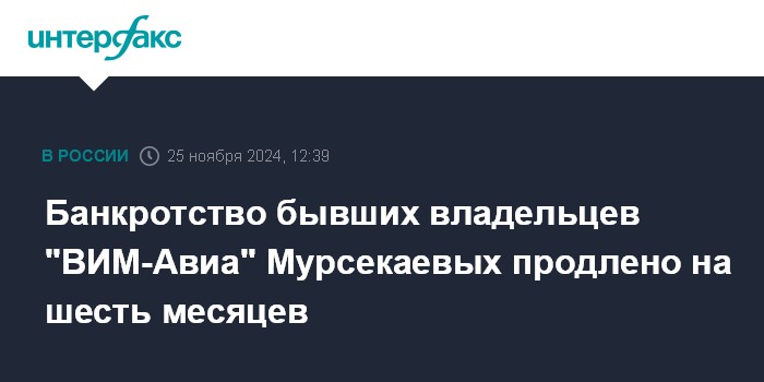 Москва. 25 ноября. INTERFAX.RU - Арбитражный суд Москвы 20 ноября по ходатайству финансового управляющего продлил на шесть месяцев процедуру банкротства бывших владельцев "ВИМ-Авиа" Рашида и Светланы Мурсекаевых.