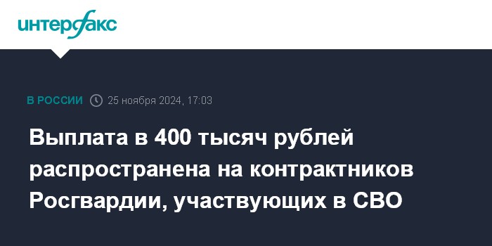 Выплата в 400 тысяч рублей распространена на контрактников Росгвардии, участвующих в СВО