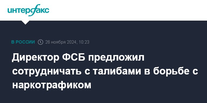 Москва. 26 ноября. INTERFAX.RU - Директор ФСБ РФ Александр Бортников считает необходимыми наладить сотрудничество с движением "Талибан" (запрещенная в РФ террористическая организация) в сферах противодействия наркотрафику и незаконному обороту оружия.