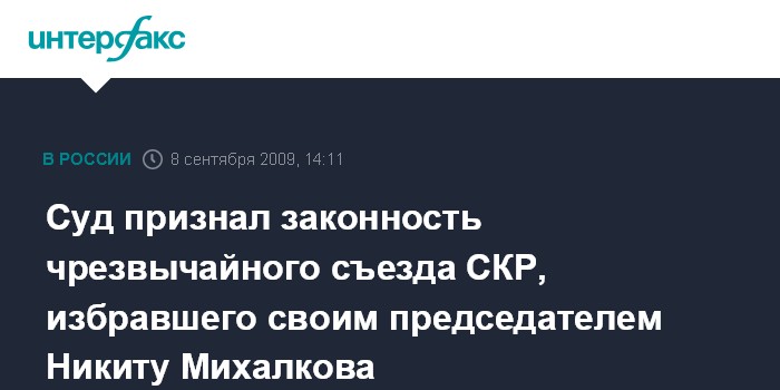 Москва. 8 сентября. INTERFAX.RU - Пресненский суд Москвы признал легитимным чрезвычайный съезд Союза кинематографистов России, на котором председателем СКР был избран кинорежиссер Никита Михалков, передал корреспондент "Интерфакса".