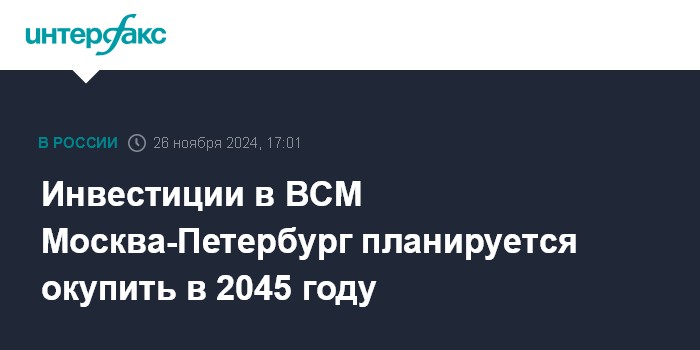 Москва. 26 ноября. INTERFAX.RU - Инвестиции в проект строительства высокоскоростной магистрали (ВСМ) Москва - Санкт-Петербург планируется окупить в 2045 году, сообщил директор по рискам ООО "ВСМ Две столицы" Николай Николаенко.