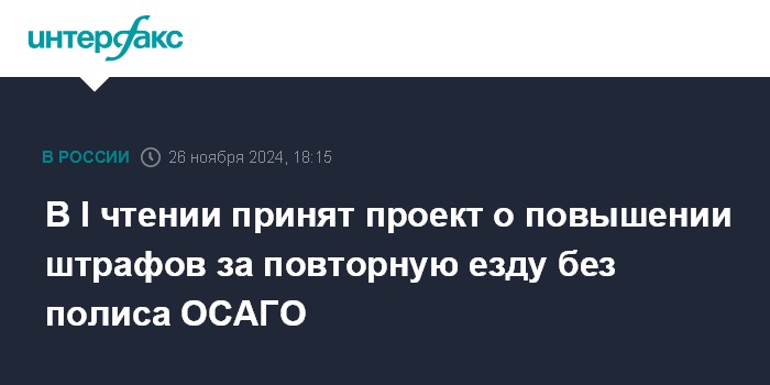 Москва. 26 ноября. INTERFAX.RU - Госдума на заседании во вторник приняла в I чтении законопроект (№728324-8), предусматривающий повышение ответственности автовладельцев за несоблюдение закона об ОСАГО, штрафы за повторно выявленные нарушения участия в движении на дорогах РФ без полисов "автогражданки" для водителей составят от 3 тыс. до 5 тыс. рублей.