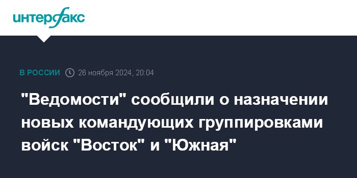 Москва. 26 ноября. INTERFAX.RU - Минобороны РФ назначило новых командующих группировками войск "Восток" и "Южная", сообщила во вторник газета "Ведомости", ссылаясь на источник, близкий к военному ведомству.
