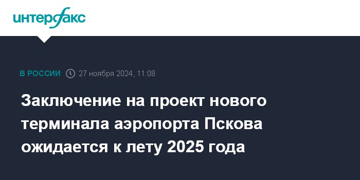 Москва. 27 ноября. INTERFAX.RU - Проект нового терминала аэропорта Пскова уже готов, заключение экспертизы по нему ожидается к лету 2025 года, сообщает пресс-служба Росавиации.