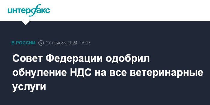 Москва. 27 ноября. INTERFAX.RU - Совет Федерации одобрил поправку к Налоговому кодексу которая устанавливает нулевую ставку НДС на ветеринарные услуги коммерческих клиник, сейчас эта льгота действует только для бюджетных клиник.