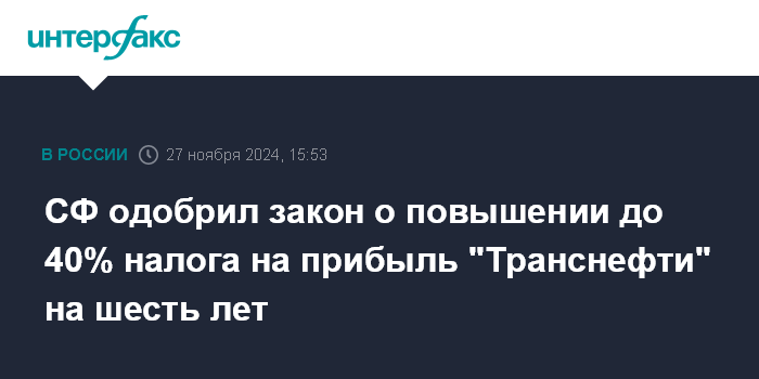 Москва. 27 ноября. INTERFAX.RU - Совет Федерации на заседании в среду одобрил закон об увеличении ставки налога на прибыль для субъектов естественной монополии, осуществляющих транспортировку нефти и нефтепродуктов по системе магистральных трубопроводов (то есть "Транснефти"), до 40% в налоговых периодах 2025-2030 годов.