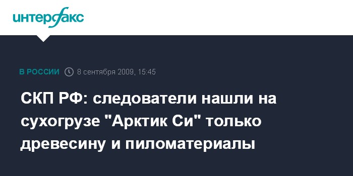 Москва. 8 сентября. INTERFAX.RU - Российские следователи в ходе осмотра сухогруза "Arctic Sea" не обнаружили на судне запрещенных к перевозке товаров. "Следователями детально осмотрен груз, находящийся на борту судна - древесина и пиломатериалы. Никакого другого груза, кроме заявленного к перевозке, к настоящему времени следователями и криминалистами не обнаружено", - заявил "Интерфаксу" во вторник официальный представитель СКП РФ Владимир Маркин.