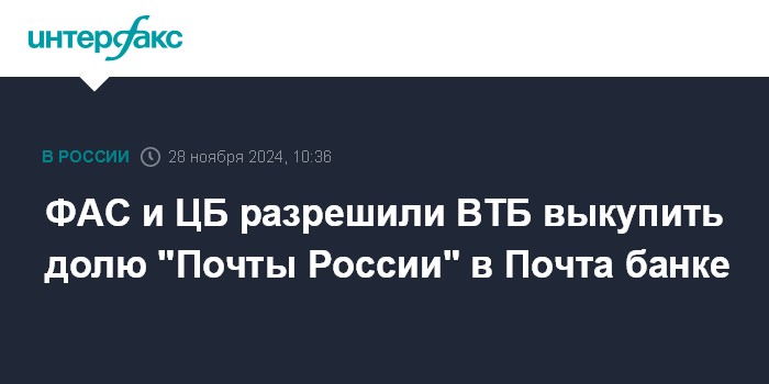 ФАС и ЦБ разрешили ВТБ выкупить долю "Почты России" в Почта банке