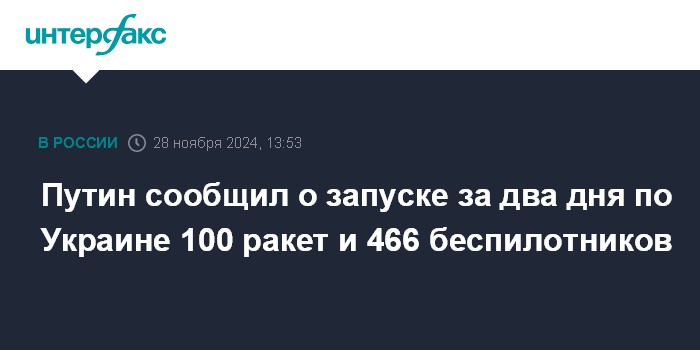 Москва. 28 ноября. INTERFAX.RU - Россия за последние два дня в ответ на применение американских ракет ATACMS запустила 100 ракет и 466 ударных беспилотников, в ночь на четверг был нанесен комплексный удар ракетами по территории Украины, заявил на саммите ОДКБ президент России Владимир Путин.