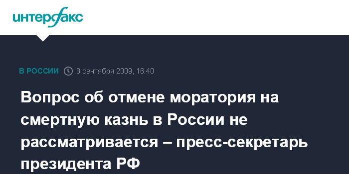 Москва. 9 сентября. INTERFAX.RU - Вопрос об отмене действующего моратория на смертную казнь в России не рассматривается, заявила журналистам пресс-секретарь президента РФ Наталья Тимакова.