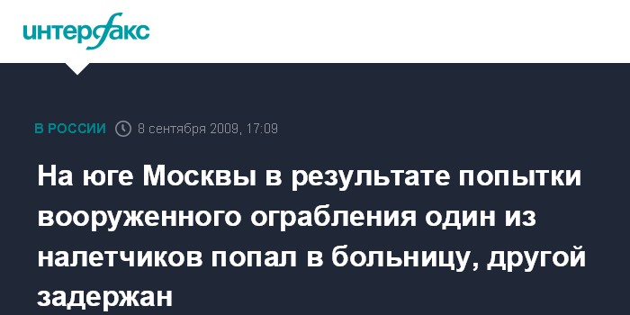 Москва. 8 сентября. INTERFAX.RU – На Чертановской улице в Москве предпринята попытка вооруженного разбойного нападения, в результате один из налетчиков госпитализирован, другой задержан, сообщил "Интерфаксу" источник в правоохранительных органах города во вторник.