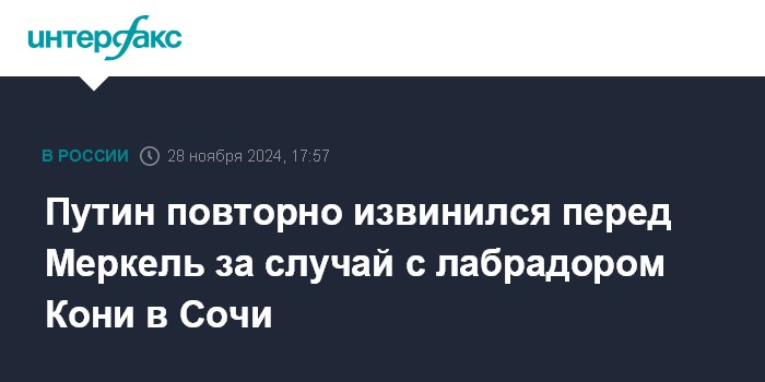 Москва. 28 ноября. INTERFAX.RU - Президент РФ Владимир Путин заявил, что готов еще раз извиниться перед экс-канцлером ФРГ Ангелой Меркель за инцидент, связанный с присутствием его собаки Конни в ходе одной из встреч в Сочи в 2007 году.