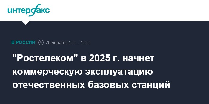 Москва. 28 ноября. INTERFAX.RU - ПАО "Ростелеком" планирует в начале 2025 года запустить в коммерческую эксплуатацию отечественные базовые станции производства ООО "Булат", в первую очередь, в рамках проекта устранения цифрового неравенства (УЦН), сообщил заместитель президента - председателя правления "Ростелекома" Алексей Сапунов.