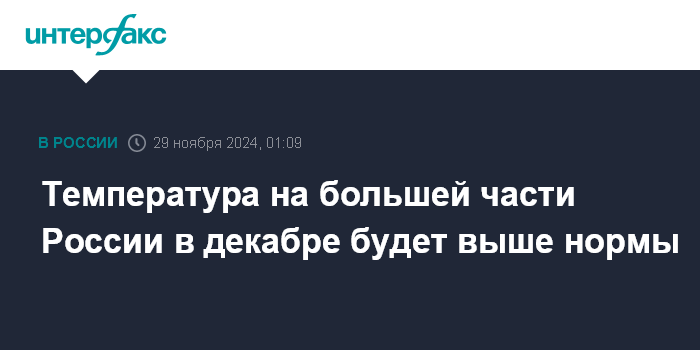 На всей остальной территории страны, а именно на оставшейся части Европейской России, куда входит и Москва, и Санкт-Петербург, в Центральном Черноземье, на юге европейской России - в Северо-Кавказском и Южном федеральных округах, температура будет около нормы. Также около нормы температура в декабре прогнозируется на юге и юго-востоке Сибири, в южной половине Якутии, Амурской области, на юге Хабаровского края и в Приморье.