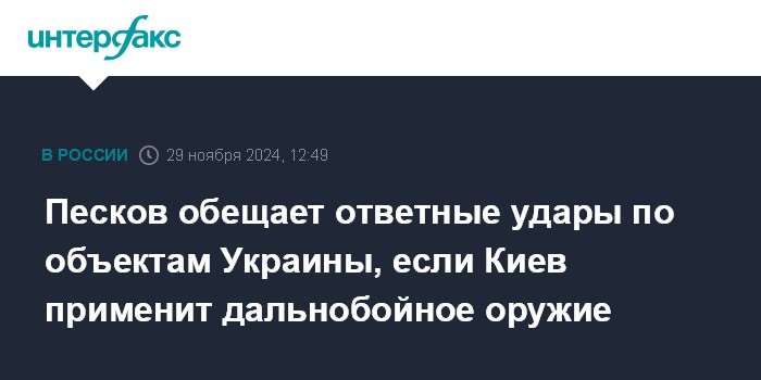 Москва. 29 ноября. INTERFAX.RU - Практика ответных ударов по военным объектам Украины будет продолжена в случае использования Киевом дальнобойного иностранного вооружения, заявил пресс-секретарь главы российского государства Дмитрий Песков.