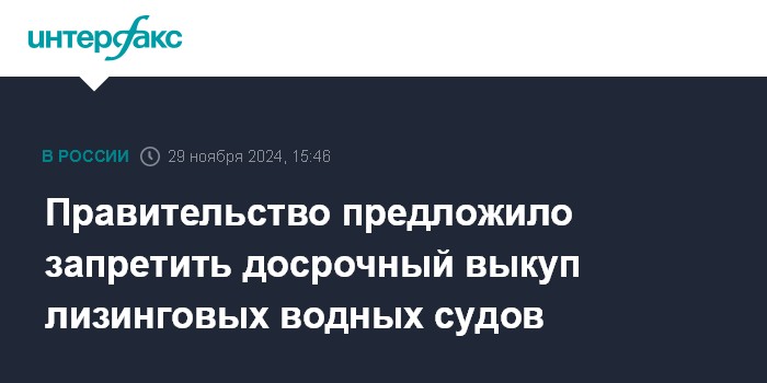 Москва. 29 ноября. INTERFAX.RU - Правительство предлагает с 2025 года отменить законодательную норму о возможности досрочного выкупа морских и речных судов, купленных в лизинг. Норма была введена в 2022 году как антикризисная.