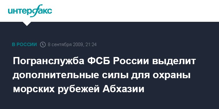 Москва. 8 сентября. INTERFAX.RU - Глава Пограничной службы ФСБ РФ Владимир Проничев обсудил во вторник с президентом Абхазии Сергеем Багапшем вопросы выполнения "Соглашения между РФ и Республикой Абхазия о совместных усилиях в охране государственной границы" от 3 апреля 2009 года. Как сообщил агентству "Интерфакс-Юг" руководитель пресс-службы Пограничного управления ФСБ РФ по ЮФО Сергей Ливанцов, отдельно рассматривался вопрос об охране морских направлений. Генерал армии Проничев сказал, что в этих целях будут дополнительно выделены силы и средства береговой охраны Погранслужбы ФСБ России.