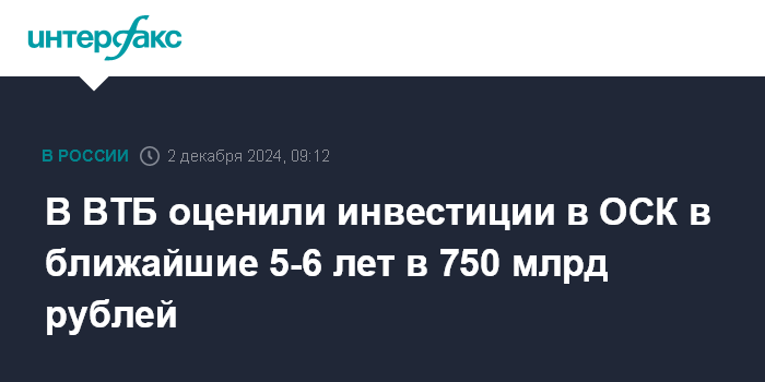 Москва. 2 декабря. INTERFAX.RU - Потребность в инвестициях "Объединенной судостроительной корпорации" (ОСК) по проектам модернизации верфей в Петербурге и развития судостроения в Приморье оценивается в сумму до 750 млрд рублей, заявил Reuters глава ВТБ Андрей Костин.