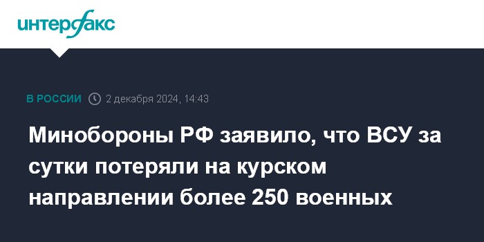 Минобороны РФ заявило, что ВСУ за сутки потеряли на курском направлении более 250 военных