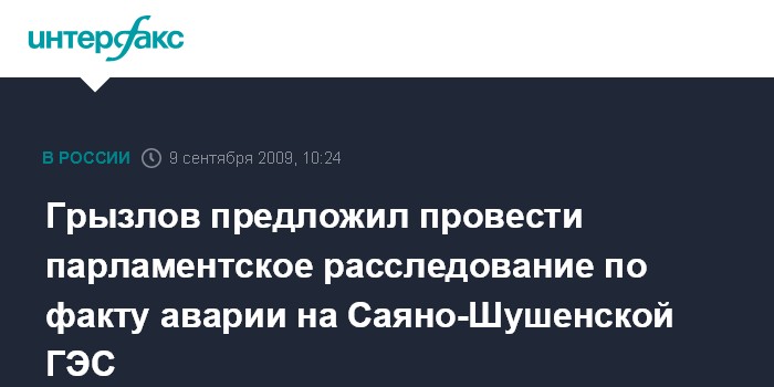 Москва. 9 сентября. INTERFAX.RU – Председатель Госдумы Борис Грызлов заявил, что Госдума должна создать комиссию и провести парламентское расследование в связи с аварией на Саяно-Шушенской ГЭС.