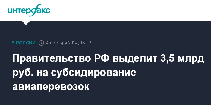 "Мы сегодня рассмотрим вопрос о выделении 3,5 млрд руб. организациям воздушного транспорта, в том числе тем, кто осуществляет полеты из труднодоступных мест по льготным билетам. Благодаря такой поддержке авиапредприятия смогут развиваться и обеспечивать транспортную связанность страны. (...) Продолжим оказывать помощь и в следующем году, необходимые для этого ресурсы предусмотрены в нашем федеральном бюджете", - сказал Мишустин на заседании правительства в среду.
