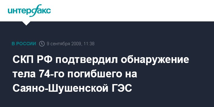 Москва. 9 сентября. INTERFAX.RU – На Саяно-Шушенской ГЭС в среду обнаружено тело 74 погибшего, его личность идентифицирована, сообщил "Интерфаксу" официальный представитель СКП РФ Владимир Маркин.