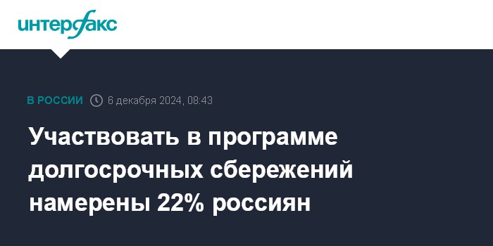 Москва. 6 декабря. INTERFAX.RU - Каждый пятый россиянин (22%) собирается принять участие в программе долгосрочных сбережений (ПДС), свидетельствуют данные опроса ВЦИОМ, опубликованные на официальном сайте социологического центра.