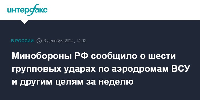 "С 30 ноября по 6 декабря Вооружёнными силами Российской Федерации нанесено шесть групповых ударов высокоточным оружием и ударными беспилотными летательными аппаратами по объектам энергетики, обеспечивающим работу военно-промышленного комплекса Украины, инфраструктуре военных аэродромов, местам сборки и хранения беспилотных летательных аппаратов", - говорится в сообщении.