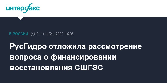 Москва. 9 сентября. INTERFAX.RU - Совет директоров "РусГидро" (РТС: HYDR) отложил рассмотрение вопроса о структуре финансирования восстановления Саяно-Шушенской ГЭС на следующее заседание. Как сообщил "Интерфаксу" один из участников заседания, в течение месяца у "РусГидро" будет достаточно собственных средств для проведения восстановительных работ - порядка 1,5 млрд рублей, оставшихся после размещения допэмиссии акций в 2009 году. В целом компании потребуются порядка 40 млрд руб. на восстановление станции.