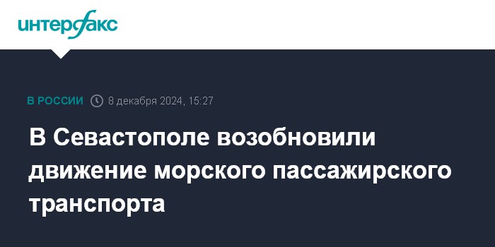 Москва. 8 декабря. INTERFAX.RU - Рейд в Севастопольской бухте открыли, морской пассажирский транспорт возобновил работу после временной остановки в воскресенье днем, сообщается в телеграм-канале дирекции по развитию дорожно-транспортной инфраструктуры города.