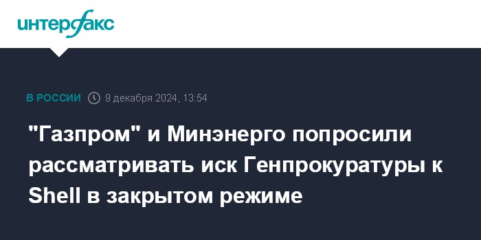 Москва. 9 декабря. INTERFAX.RU - ООО "Газпром экспорт" и Министерство энергетики на прошлой неделе направили в Арбитражный суд Москвыходатайства о рассмотрении дела по иску Генпрокуратуры к Shell о взыскании вреда на сумму 1 млрд евро в закрытом судебном заседании, сообщается в арбитражной картотеке.