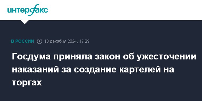 Москва. 10 декабря. INTERFAX.RU - Госдума приняла во втором и в третьем чтении закон об ужесточении уголовной ответственности за картельный сговор на обязательных в силу закона торгах.