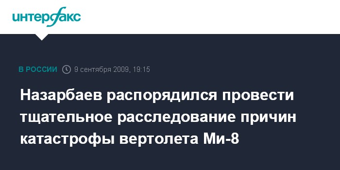 Москва. 9 сентября. INTERFAX.RU - Президент Казахстана Нурсултан Назарбаев выразил соболезнования семьям пограничников, погибших при крушении вертолета МИ-8, на котором они выполняли боевую задачу по охране государственной границы, сообщила в среду пресс-служба главы государства. Согласно сообщению пресс-службы, Н.Назарбаев поручил правительству страны оказать материальную помощь и необходимую поддержку семьям погибших, а также пострадавшим в аварии.