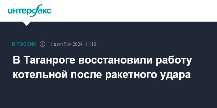 Москва. 11 декабря. INTERFAX.RU - В Таганроге завершили ремонт на котельной, которая была повреждена в результате ракетной атаки, сообщила глава администрации города Светлана Камбулова.