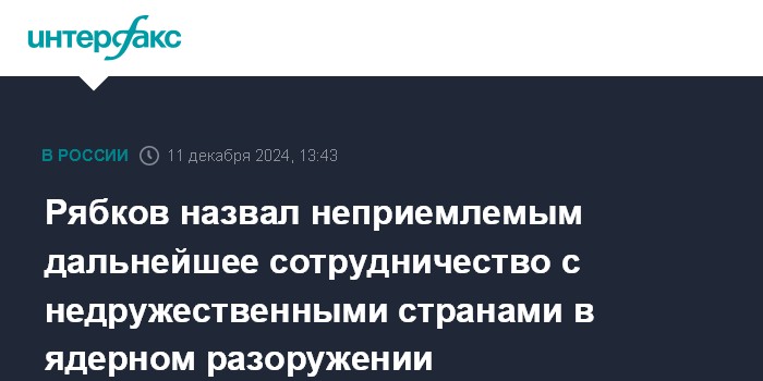 Москва. 11 декабря. INTERFAX.RU - В Москве считают политически неприемлемым дальнейшее сотрудничество в сфере ядерного разоружения с государствами, которые проводят антироссийскую политику, заявил замглавы МИД РФ Сергей Рябков.