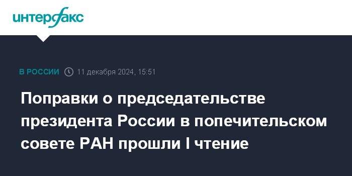 Москва. 11 декабря. INTERFAX.RU - Законопроект, предусматривающий председательство президента России в попечительском совете Российской академии наук и возможность главы государства принимать решения о его составе, принят в первом чтении.
