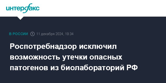 Москва. 11 декабря. INTERFAX.RU - В России исключены утечки опасных патогенов из биолабораторий, заявили в Роспотребнадзоре после появившейся информации о том, что из биолаборатории в Австралии пропали 323 флакона, содержащие образцы опасных вирусов.