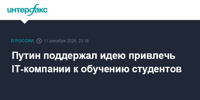 Москва. 11 декабря. INTERFAX.RU - Президент РФ Владимир Путин в ходе совещания с членами правительства в среду назвал справедливой идею привлечения IТ-компаний к обучению студентов по профильным специальностям.