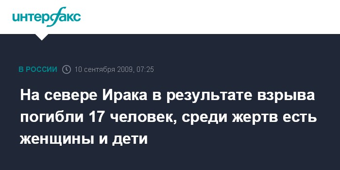 Лондон. 10 сентября. ИНТЕРФАКС - По меньшей мере 17 жителей курдской деревни на севере Ирака погибли и еще 13 получили ранения в результате взрыва начиненного взрывчаткой грузовика, сообщает в четверг утром британская телерадоивещательная корпорация Би-би-си.