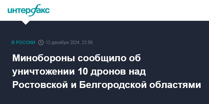Москва. 12 декабря. INTERFAX.RU - Средства противовоздушной обороны сбили шесть украинских беспилотников над Ростовской областью и четыре - над Белгородской, сообщили в Минобороны РФ.